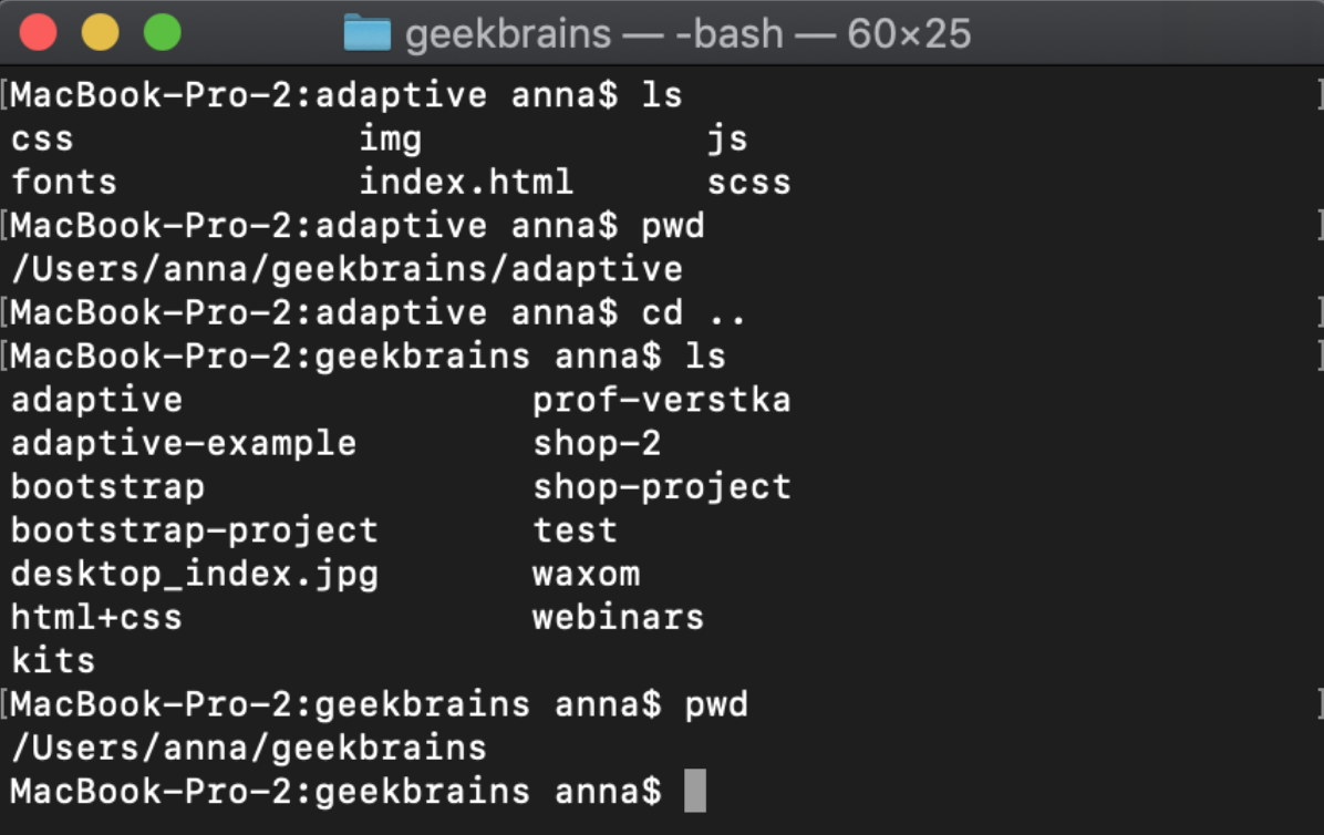 cd .. — поднимает вас на один уровень в файловой системе. Например, если находились в ~geekbrains/adaptive, то после команды окажетесь в ~geekbrains. Также можно использовать запись cd ../.. — так вы подниметесь на два уровня. Уточним пример: будем использовать pwd, чтобы видеть, где мы находимся, и ls, чтобы смотреть содержимое папок: