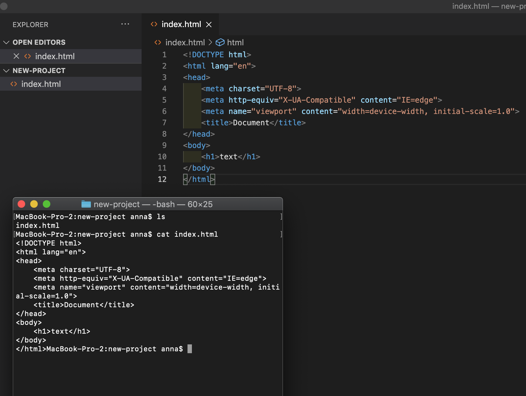 cat название — показывает текстовое содержимое файла. На скриншоте видим его у файла index.html, открытого в VSCode, а также наблюдаем вывод в консоли.