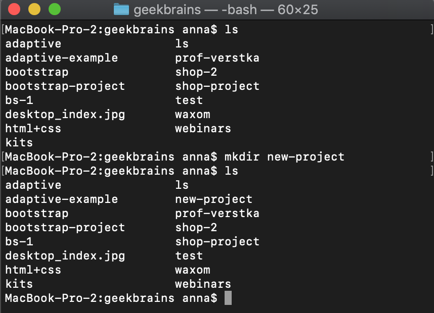 mkdir название папки — создаёт папку. В примере сначала и в конце просматриваем папки при помощи ключа ls, чтобы убедиться, что папка создалась: