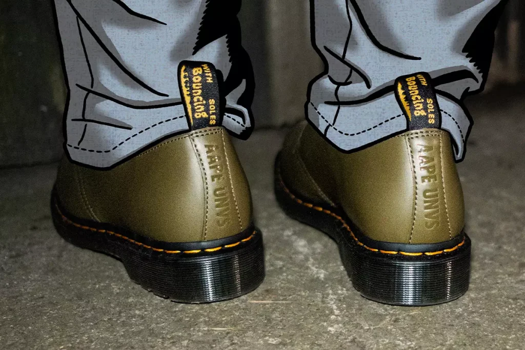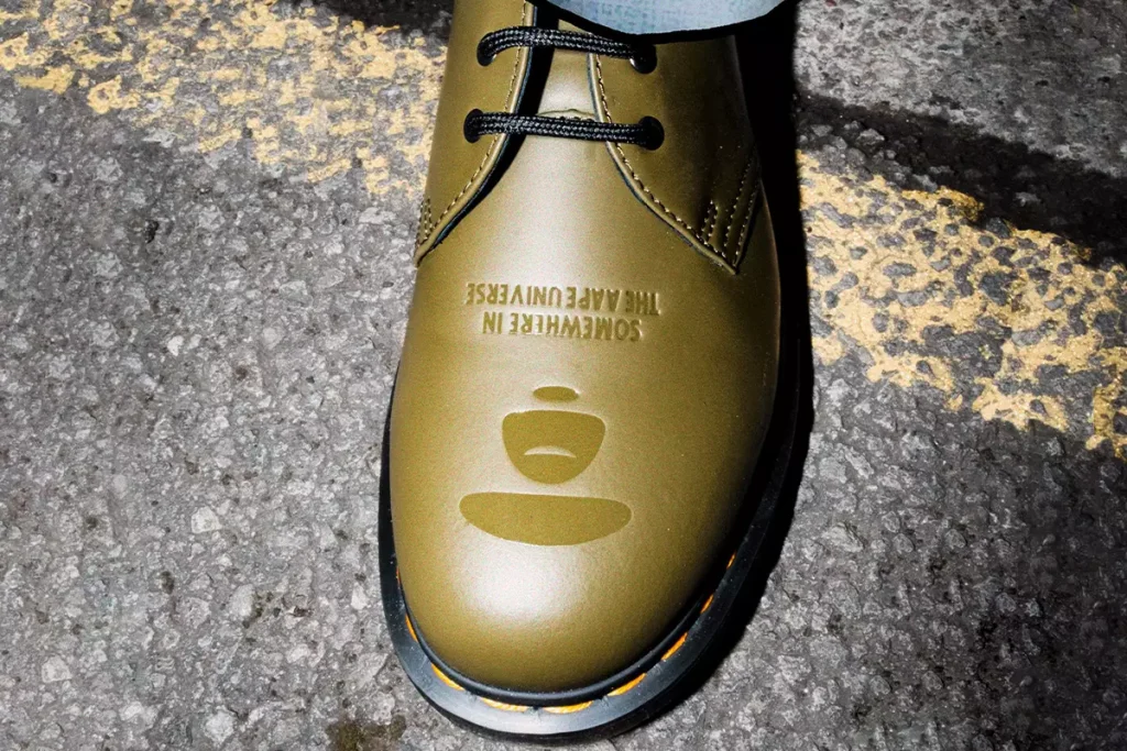 Совместное предложение, изготовленное из фирменной гладкой кожи Dr. Martens, представлено в классическом черном и в оливковом цвете. Детализированный тисненым логотипом AAPE Moonface и текстом SOMEWHERE IN THE AAPE UNIVERSE, и другие особенности включая брендированную пяточную петлю, которая с гордостью отображают историю Dr. Martens, а также двухцветную этикетку специального релиза.