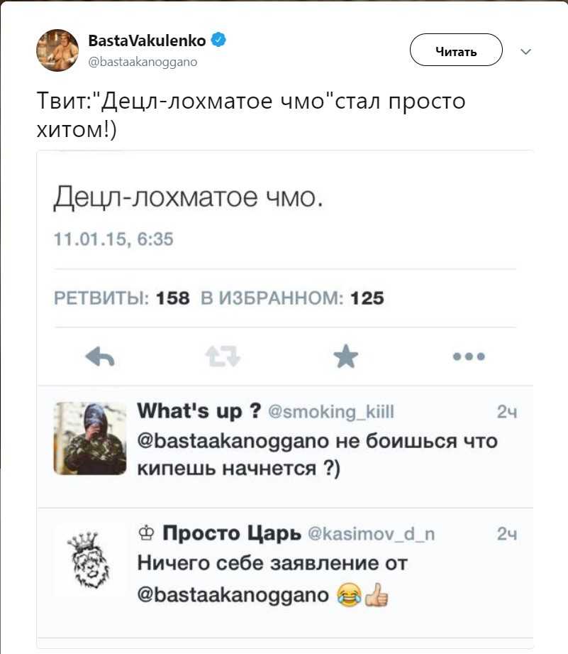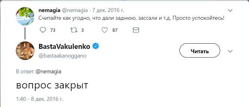 После чего видеоблоггеры из Немагии начали нелицеприятно высмеивать мать Басты в своих следующих видео. Далее последовал ролик о Басте, в котором его мать сравнили с порноактрисой. На что Василий в твиттере пообещал найти и побеседовать с матерями юмористов. Музыкант потребовал публичных извинений перед матерью, которая очень расстроилась просмотрев их ролик. Также Баста решил устроить конкурс, опубликовав твит с призывом встретить блоггеров из “Немагии” и создать «экстремальное фото или видео с ними». Далее конечно же Василий объявил этот твит розыгрышем и выложил фото жены одного из юмористов из Немагии, назвав эту фотографию “победителем”.