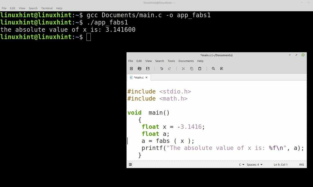 пустота основной (){плавать Икс =-3.1416;плавать а; а =потрясающие( Икс );printf(«Абсолютное значение x равно: %f\n», а);