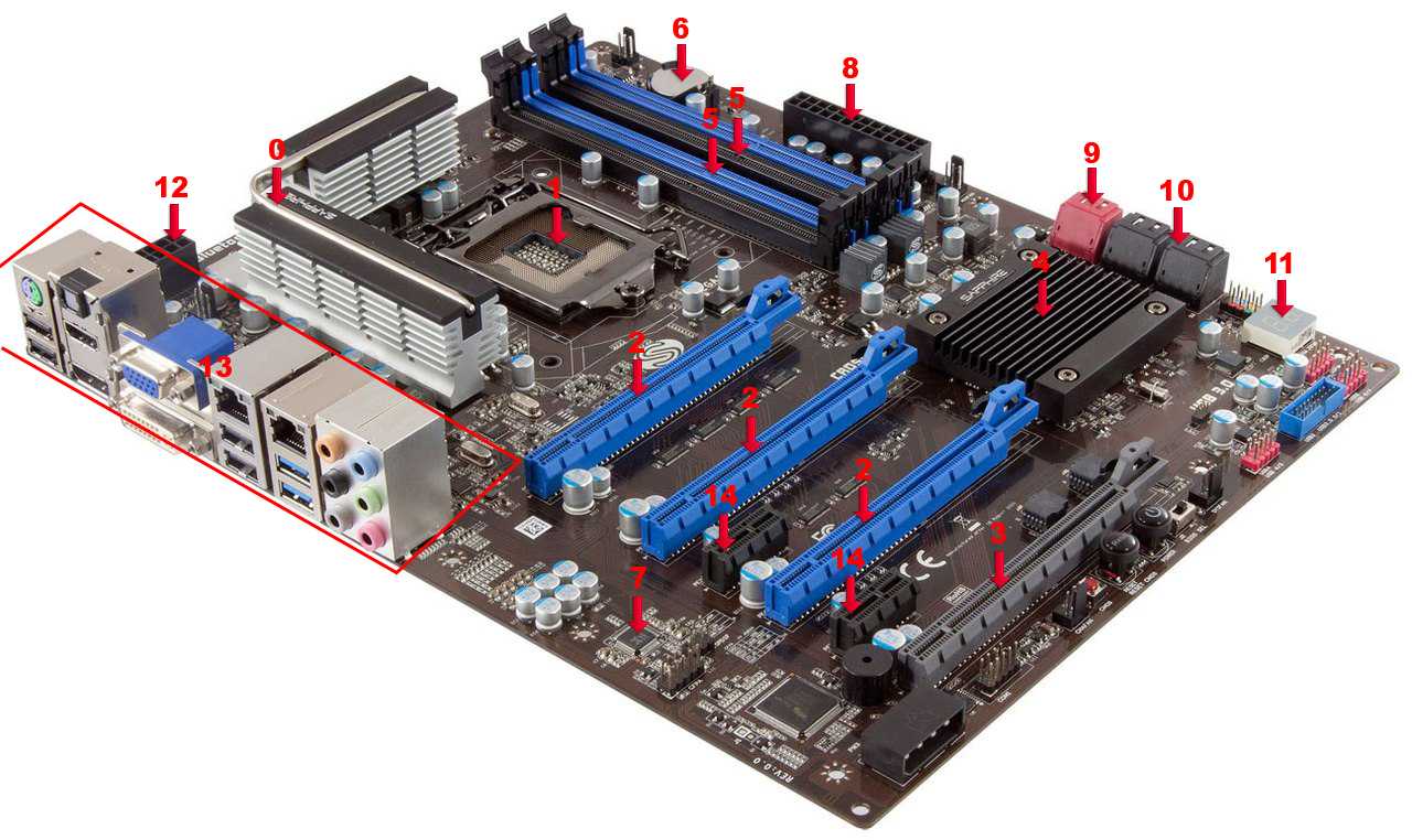 (13) Задняя панель материнской платы с внешними разъёмами. В разъёмы на этой панели подключаются разнообразные периферийные устройства, такие как мышь, клавиатура, колонки, наушники, а также многие другие. Теперь когда мы прошлись по раскладке компонентов на материнской плате, можно переходить к рассмотрению отдельных блоков и параметров для выбора материнской платы. Так как данная статья является вводной, то все будет описано вкратце и уже гораздо глубже рассмотрено в отдельных статьях. Итак, поехали.