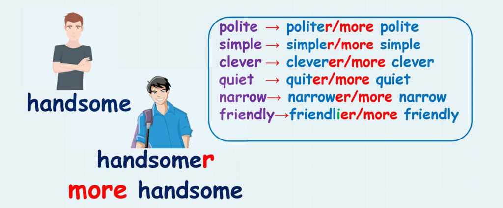 Чаще всего эти прилагательные имеют такие окончания: -er, -le, –y, -ow, -some