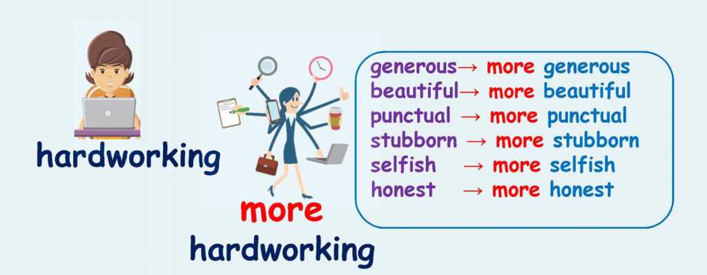 Для образования сравнительной степени всех прилагательных из 3-х слогов и некоторых прилагательных из 2-х слогов используется конструкция: