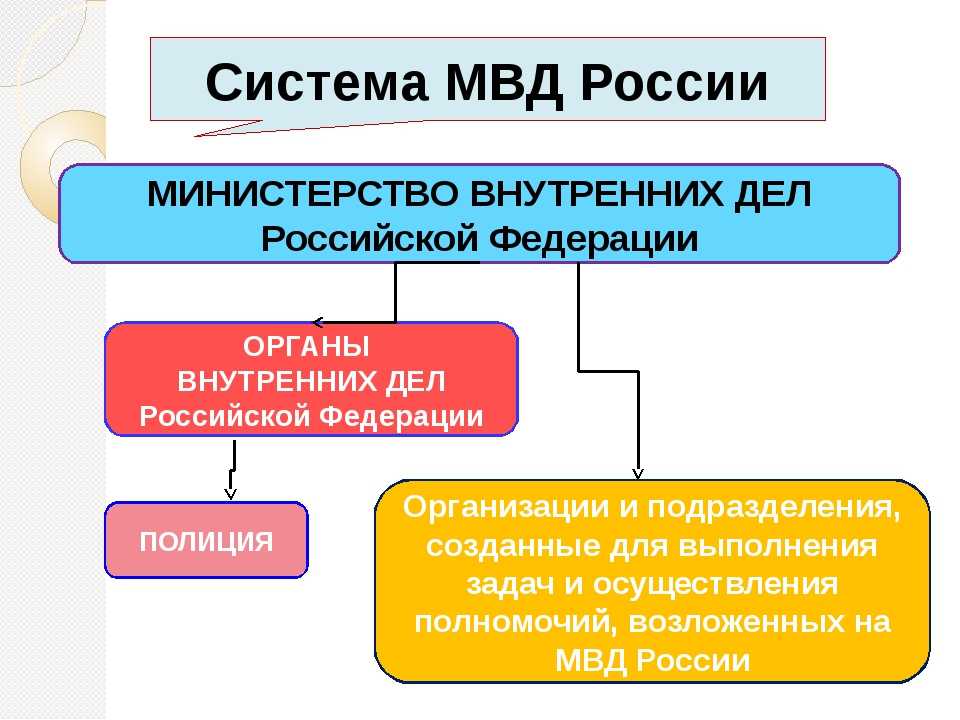 Органы внутренних дел образуют централизованную систему, возглавляемую Министерством внутренних дел (МВД) России, которая включает в себя: