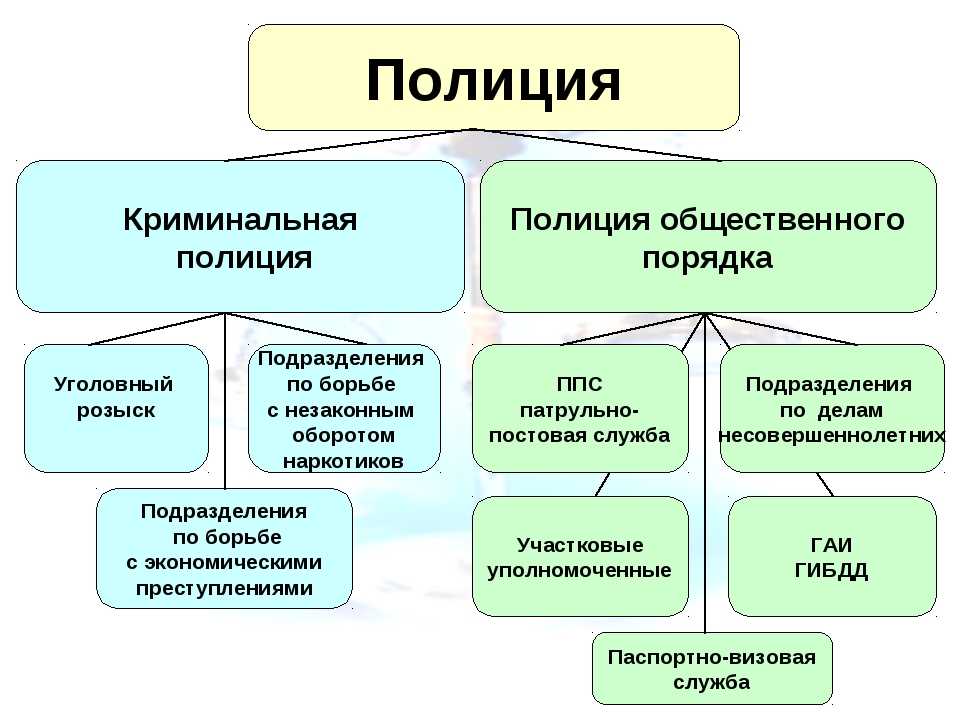 Полиция подразделяется на налоговую, военную, наркополицию. В состав также входят: участковые пункты, ДПС и ГИБДД, центры, занимающиеся разбирательствами с правонарушителями на потребительском рынке и обеспечивающие наблюдение за исполнением административного законодательства. В Московской области и республике Татарстан работает еще экологическая полиция.
