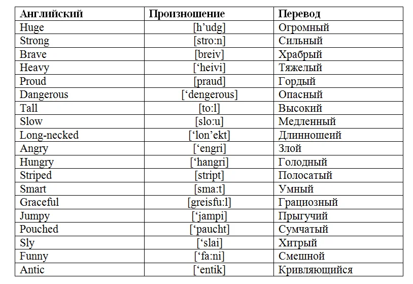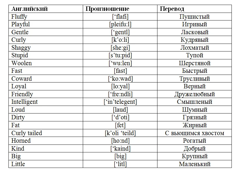 Любое описание животного (Description of animal) не может быть без определённого набора слов и фраз. В описании домашних и диких животных присутствуют схожие прилагательные, но не стоит забывать, что не все качества можно относить как к обоим типам животных. Ниже таблицы будут представлены описания животных (description of animals) с переводом, которые можно будет использовать в качестве примера для самостоятельного описания животного на английском.