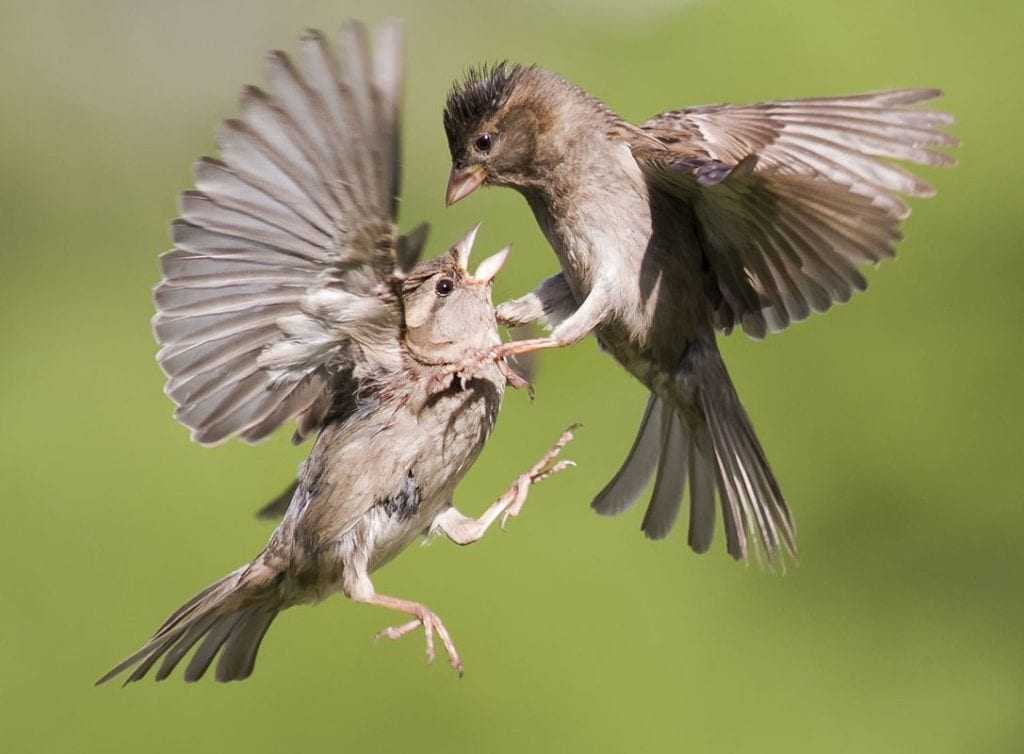 Воробьи — оседлые птицы, которые любят все время жить на одно и той же территории. Из-за этого им нередко приходится терпеть конкуренцию со стороны других претендентов на землю, что приводит к дракам и выяснением отношений.