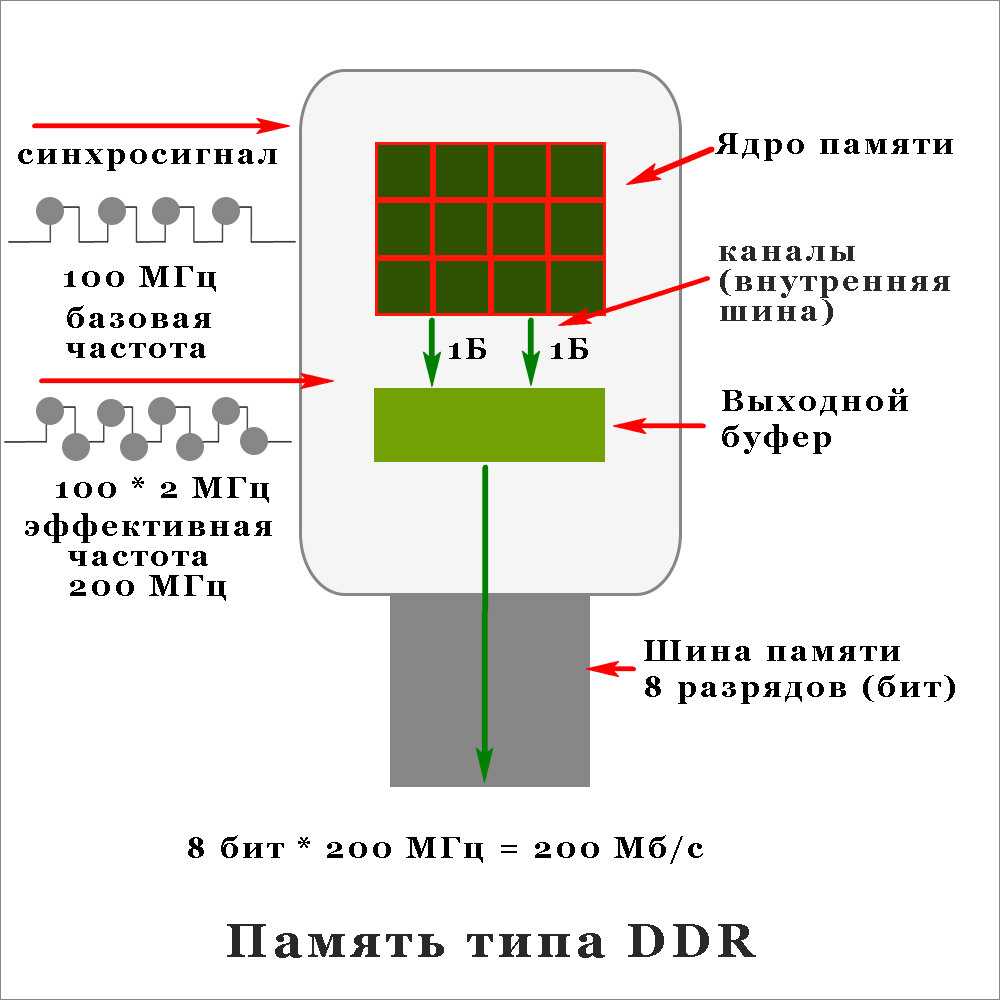 Для памяти DDR принято различать два типа частоты. Частота, с которой на модуль памяти подаётся синхросигнал, именуется базовой, а частота, с которой с выходного буфера считывается информация — эффективной. Рассчитывается она по следующей формуле: