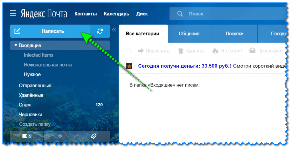 После того, как вы заведете себе ящик и войдете в него, пред вами предстанет достаточно простое меню. Для создания письма — достаточно кликнуть по кнопке «Написать» в верхнем углу.