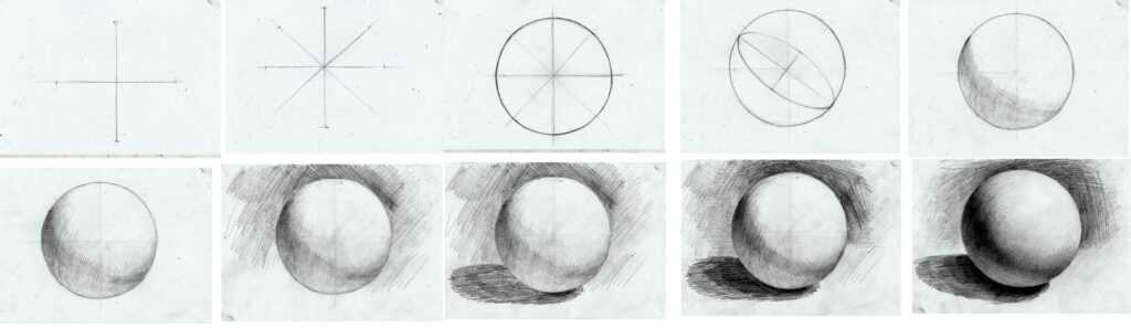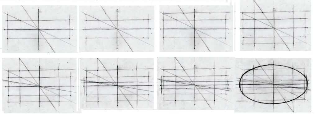 Художники рисуют именно эллипсы, а не овалы. Художники строят эллипсы по двум осям. У эллипса есть большая ось и малая ось. Если предмет ровно стоит на горизонтальной плоскости и никуда не наклонен, то большая ось эллипсов будет строго горизонтальна, а малая ось вертикальна и совпадает с осью предмета (ось предмета ровно стоящего на горизонтальной плоскости всегда вертикальна). С построением предметов, имеющих форму тел вращения мы разберёмся чуть позже, для начала нам надо разобраться с построением эллипса (то есть круга в перспективе). Оси эллипса всегда перпендикулярны друг другу. Итак мы изображаем круг лежащий на горизонтальной плоскости. Изображаем мы его, естественно, в перспективе. То есть вместо круга мы видим эллипс. Мы определили ширину нашего эллипса (она совпадает с шириной круга) и определили видимую высоту. Проведя визирование и определив пропорции, мы выяснили, что высота нашего эллипса равна половине ширины.