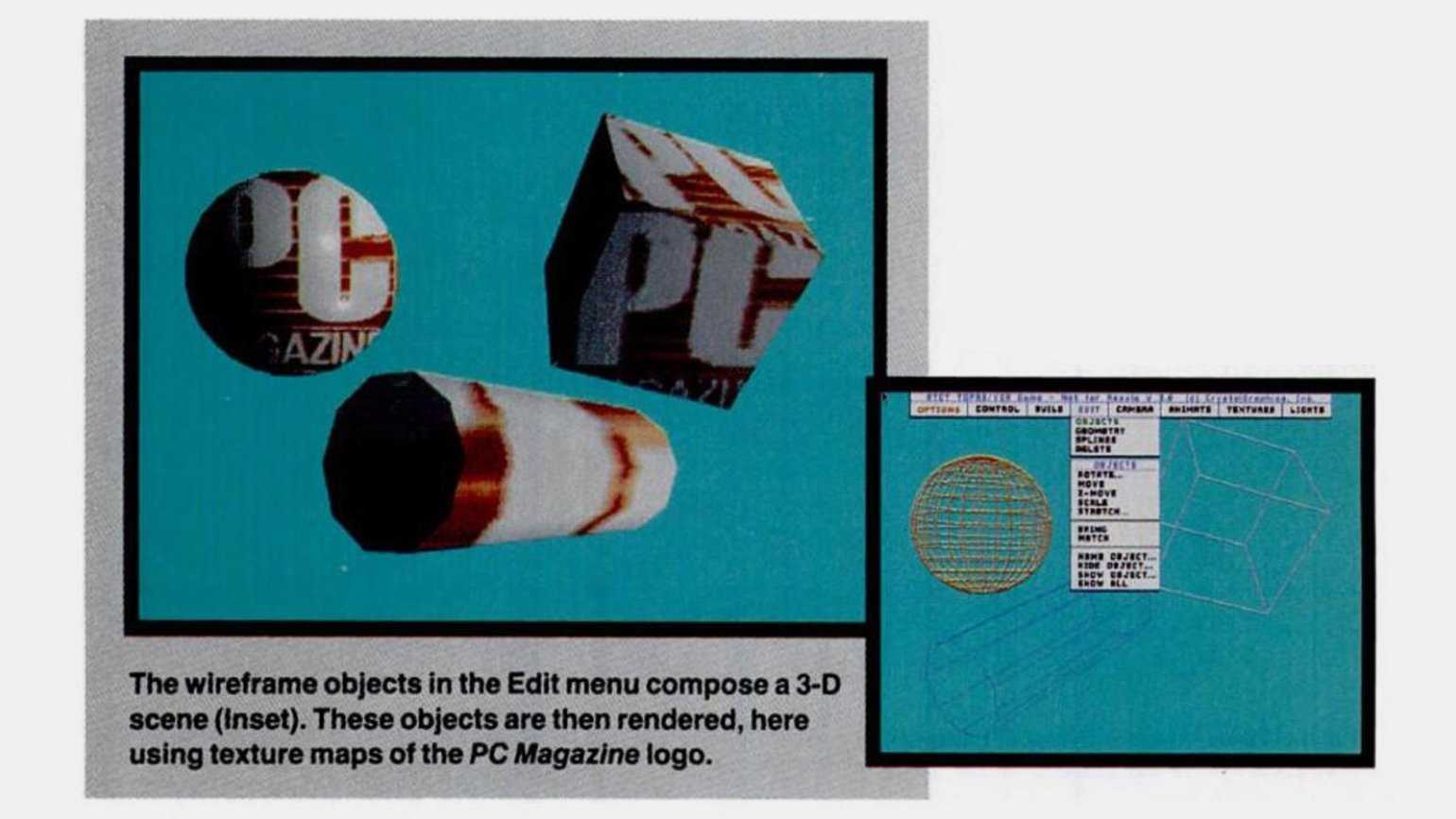 Журнал PC Magazine — выпуск 16 апреля 1991 года. Подпись под картинкой: 3D-сцена в окне Edit состоит из моделей будущих объектов. В данном случае упомянутые объекты уже отрендерены с использованием текстуры, для которой мы выбрали логотип PC MagazineИзображение: PCMag /